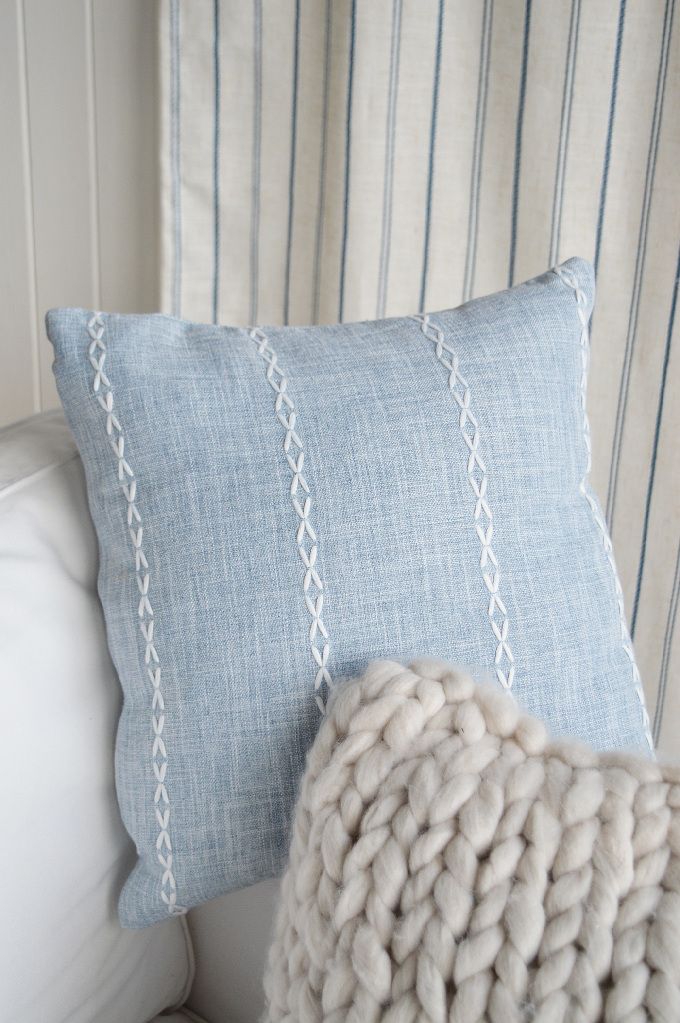 The Friendship Cushion brings soft coastal charm to your home with its pale blue or white fabric and delicate white stitched detailing.