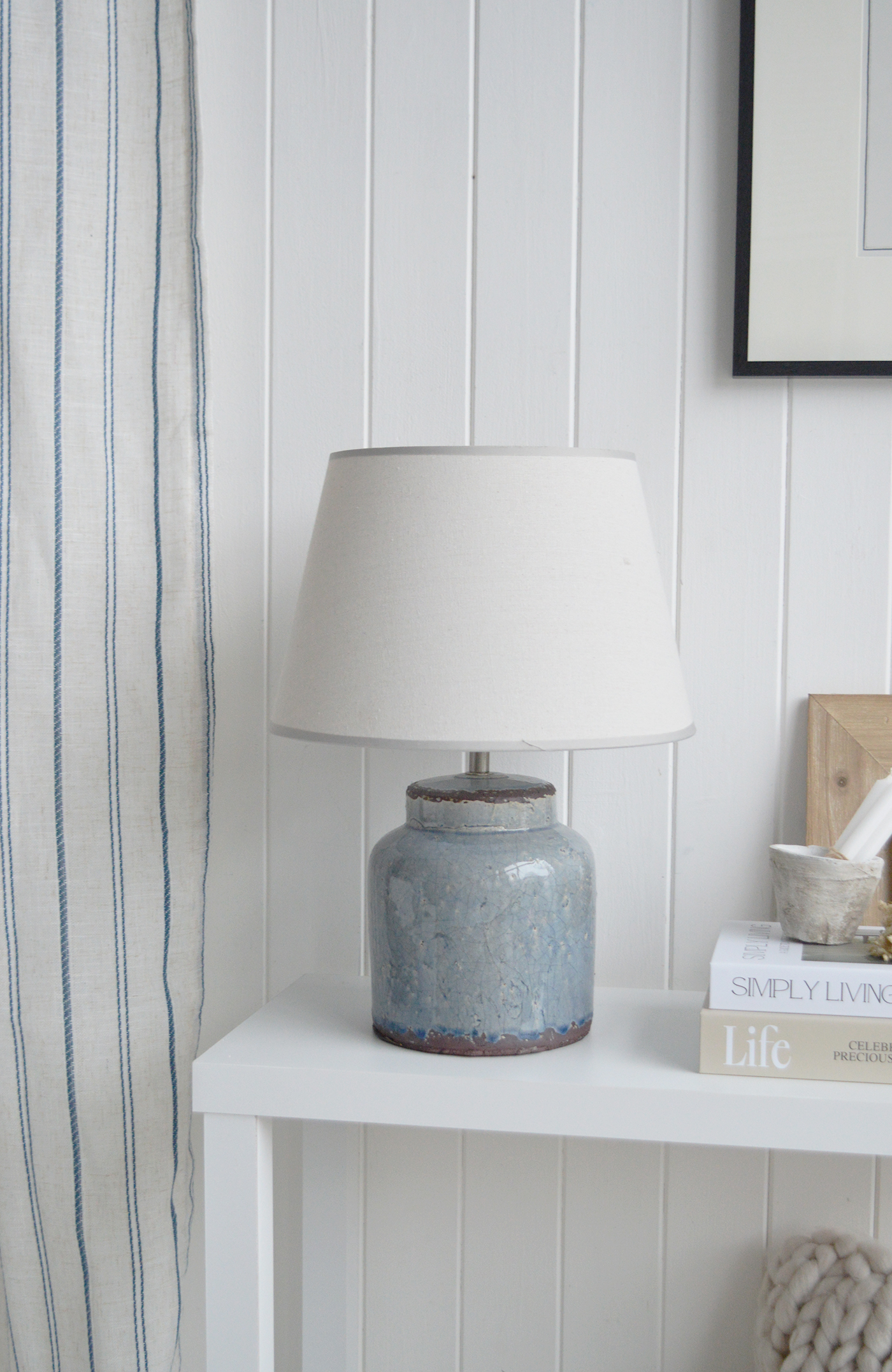 Our Blue Compton lamp with a crackled aged ceramic base and off white shade.