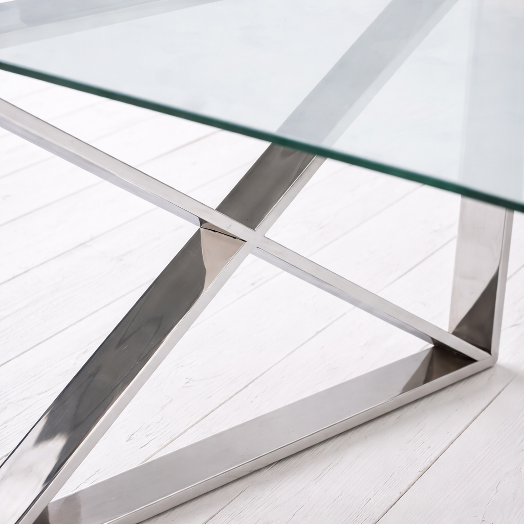 The Kensington Coffee Table brings understated elegance to neutral and Hamptons-style living spaces. With a clear tempered glass top and sculptural stainless steel cross-frame base, it feels both contemporary and timeless.